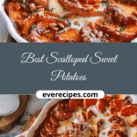 These Best Scalloped Sweet Potatoes are a creamy, savory side dish featuring tender sweet potato slices baked in a garlic-thyme cream sauce and topped with golden melted cheese—perfect for fall and holiday dinners.